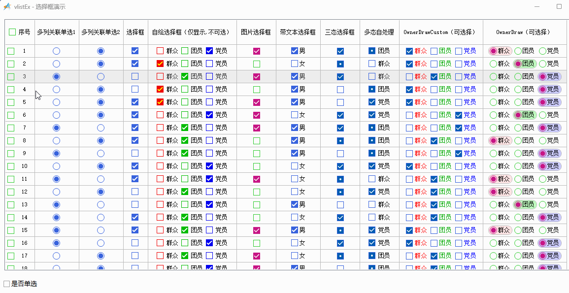 // 设置 2、3、4、7 列为 _vlistEx_ColType_CheckBox 类型,自动绘制选择框。