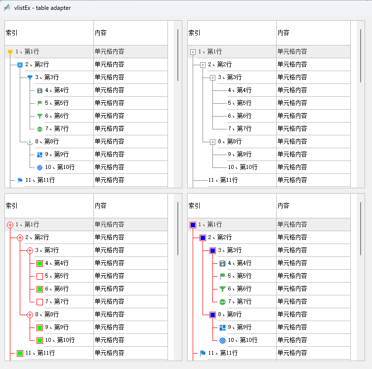 ..table.push(t,{"[@rowindex]、第"++i++"行","单元格内容", "[@treeLevel]"=tree[i]})